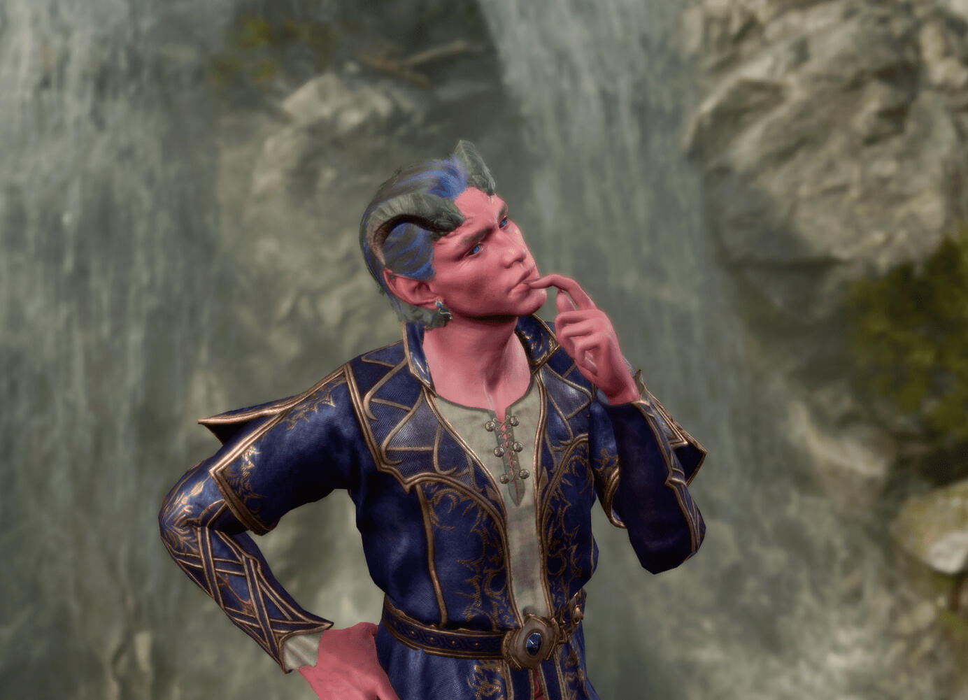This story is a work-in-progress, and therefore is subject to change.***Aster was born in -3524 DR as the son of King Fenren and Queen Ravariel of Erimiirn (located near the Sword Coast). His father, whom he was always quite close to, passed away from an illness when Aster was 5 years old. Other than that, Aster had a good and uneventful childhood, growing up with his best friend, Callix.***On his 10th birthday, his mother gave him a winter wolf hybrid as a pet. He named the dog Rua, and they became best friends.***At age 14, Aster and Callix began dating. When he was 16, it was in combat training that he cast his first spell. He had prayed to Selûne all his life, and she finally granted him her favor.***When Aster was 17, on Callix's 18th birthday, the two got engaged. It was also that day that Callix became Aster's personal guard and swore his oath.***They announced their engagement when Aster was 24, waiting until they felt ready to take the throne. They were set to marry on the winter solstice when Aster was 26. However, a month before that, disaster struck.There was a magical explosion in the castle, making the castle begin to crumble and the air become thick with a dark, magical fog. Aster's mom didn't survive, crushed under rubble.Callix must've been closer to the origin, because he had a magical infection, some necrotic energy destroying him. He eventually succumbed to his injuries, and no amount of healing Aster could throw at it would make a difference.Syllen, the court oracle and an older brother figure to Aster, took him to the safe room, where he decided that in order to save Aster, the only course of action was to send him to another plane. Aster had no choice, and was sent to the Astral Plane.***He spent about 5 years in the Astral Plane before Elminster (although Aster didn't know who he was at the time) found Aster and told him to try using a color pool to get out. He entered a green color pool, assuming it would take him back to the Prime Material plane, but unfortunately it led to the Feywilds instead.***In the Feywilds, he finds a twisted, ruined, fey equivalent of his castle. He spends another 14 years there before an eladrin he met figures out how to send him back to the Prime Material.***He spends the next two years in Baldur's Gate, learning that although to him it felt like 19 years, it was actually about 5000. He is just about settled in to life in the new time when he gets taken aboard the nautiloid.***At some point in act 1, before the underdark or the mountain pass, but after a lot of other act 1 events, Aster and his party are helped in a fight by a mysterious stranger that turns out to be Callix, except he has no memories, and is undead.***Callix takes half the group through the underdark, while Aster takes the other half through the mountain pass. They meet back up in the shadow-cursed lands.***Throughout the rest of the game, Aster is falling for Gale while also struggling with feelings about Callix's return and, of course, their impending doom.***The following section is what I consider to be the future. It has not happened yet, but it will.***After killing the nether brain, Aster, Callix, Gale, and possibly others from the group if they choose to join, head out on an adventure to free Callix permanently. At this moment, without the protection of the Astral Prism, he is beginning to feel the pull of the person who resurrected him. Aster eventually realizes that this person is Syllen. They kill him, and Callix decides he needs to figure himself out alone, so he leaves.***For the moment, Aster and Gale settle down in Waterdeep. At some point, a tiefling they met in the grove named Kyxire shows up to ask for their help. He wants to explore the planes for research, but he isn't much of a fighter. He remembers all that Aster and his party were able to accomplish, and asks him to accompany him as a guard. He and Gale accept, following him through the planes so he can do his research safely.***After that, it is a long time before Callix returns. He comes back and suggests that they return to Erimiirn and repair it. Aster agrees, and he asks Gale to come with him. They all end up returning to Erimiirn, seeing the lasting destruction, and slowly rebuild the city. Aster takes the throne again, Callix and Aster get married, as well as Aster and Gale, and all three rule together.***Aster has three children, Wyrin Feldrin-Lumienn, Orlan Dekarios-Lumienn, and Corril Feldrin-Lumienn. Wyrin, the oldest and only girl, has Aster's eyes and Callix's hair. Orlan, the middle child, has Gale's brown hair, but Aster's blue highlights, as well as Aster's eyes. Corril, the youngest, has a mix of Aster and Callix's hair, his highlights coming out purple, and Callix's eyes.